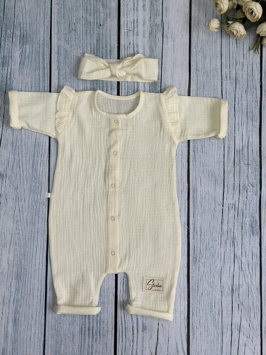 Теги: Купить оптом детский комбинезон . 336-СЛ. Комбинезон с повязкой для девочки из муслина, хлопок 100%, размеры 56,62,68, сливочный цена,отзывы официальный сайт "Стеша Нижнекамск"